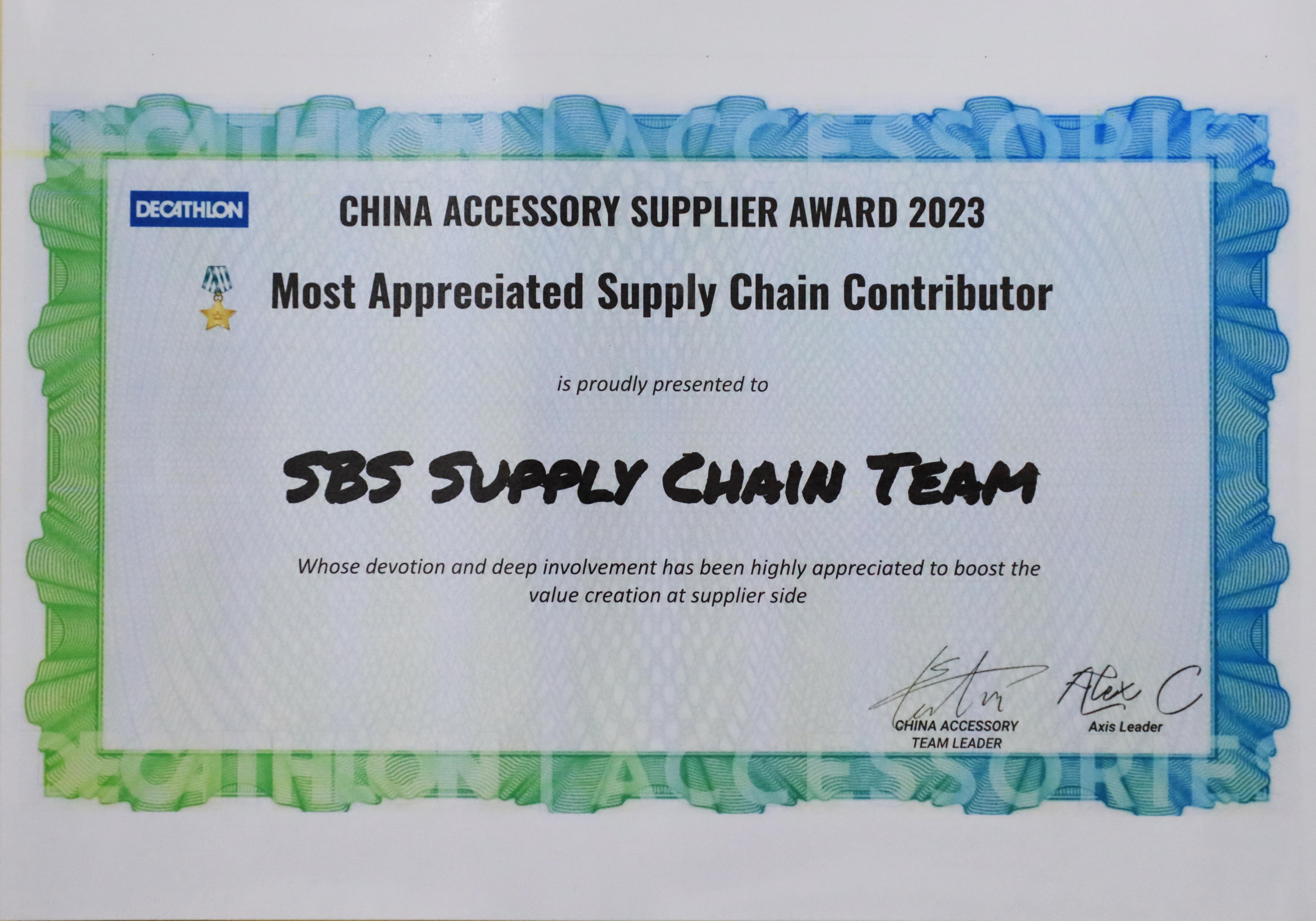 近日,SBS拉链荣获“2023年迪卡侬中国辅料供应商最佳供应链贡献奖”,迪卡侬对于我司交付能力给予了高度肯定,嘉奖交期快、灵活的柔性供应计划管理。...